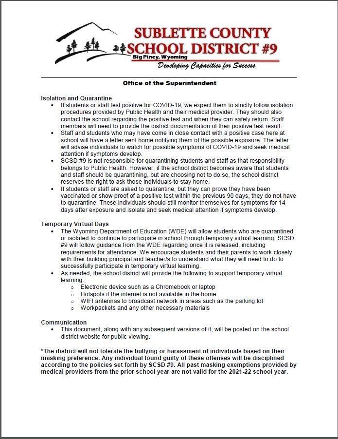 SCSD #9 encourages staff and students (12 and older) to get vaccinated. Vaccinated individuals do not have to quarantine if they are exposed to the virus. So, if you are not necessarily opposed to the COVID-19 vaccine, but for some reason have not made the time to get your children (12 and older) vaccinated, please consider doing so now. It just might save them from having to miss many days of school or an important athletic event or other extracurricular activity.